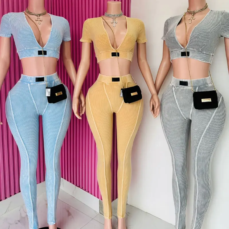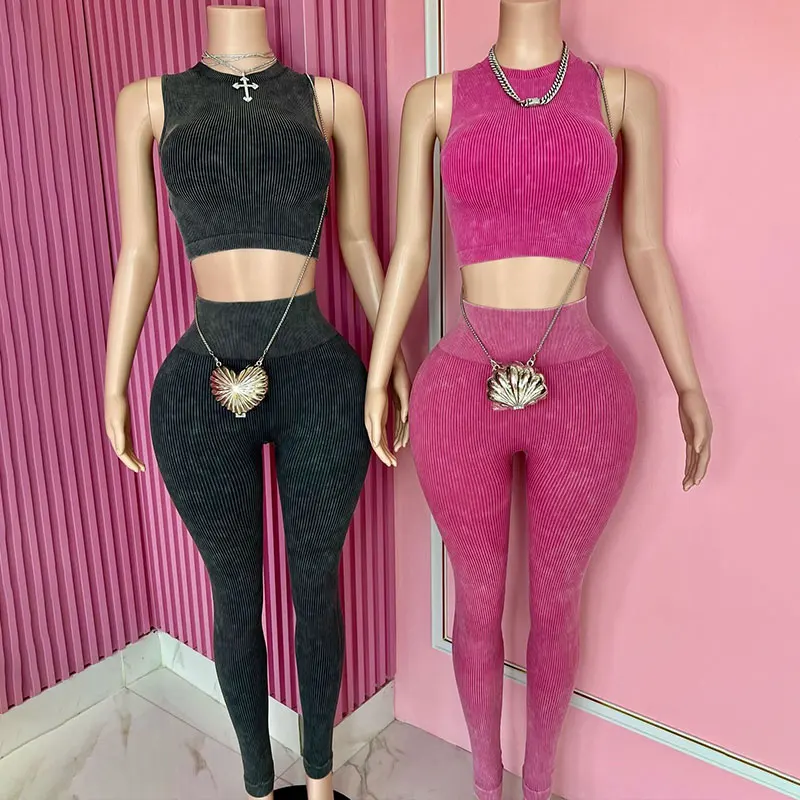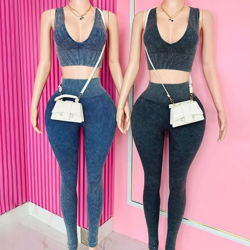 Huili Manufacturer High Quality Acid Wash Vintage Crop Gym Activewear Skinny Loungewear Workout Two Piece Women's Leggings Set